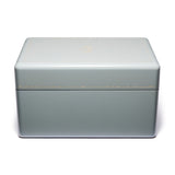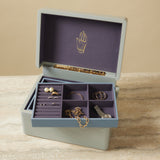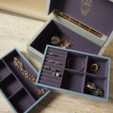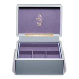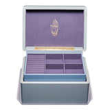 The dusty blue exterior opens to reveal a lacquer top tray with ring storage and open compartments. This top try lifts out to reveal a larger middle compartment tray, below which is is an expansive third level for larger pieces and assorted items. A perfect place for a watch, pendant or a brooch.
