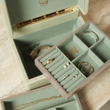 The pale green exterior opens to reveal a warm grey and green tray with ring storage and open compartments. The top tray is removed to reveal a larger middle compartment tray, below which is is an expansive third level for larger pieces and assorted items. A perfect place for a watch, pendant or a brooch.